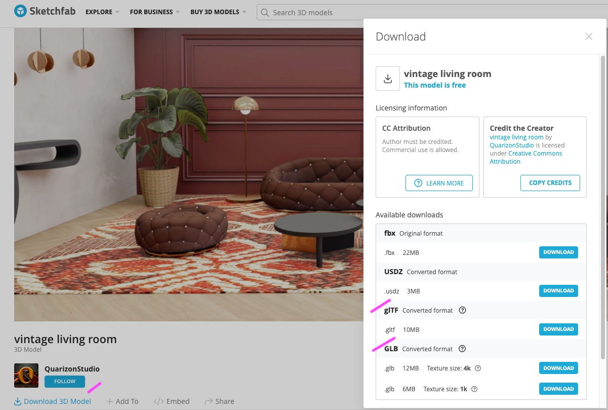 Click on Download 3D model and Select glTF or GLB format only (other formats are not supported)